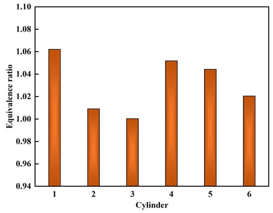 Figure 9 compares the concentration of fuel–air mixture within the six cylinders. As shown in the figure, due to the variability in the mass of air, fuel, and exhaust gas entering each cylinder, the equivalence ratios among the cylinders also exhibit variations. Cylinder 1 has the highest equivalence ratio, with the richest mixture, while cylinder 3 has the lowest equivalence ratio, with the leanest mixture. The mixture in cylinder 2 is slightly richer compared to that in cylinder 3. Figure 10 presents contour plots of the equivalence ratio for each cylinder. As shown in the figure, the CTCV of mixture concentration distribution was obvious. For cylinder 1, which is located closer to the inlet, the fuel–air mixture entering the cylinder is not well mixed yet due to the short distance for mixing, while for cylinder 6, the longer distance makes the mixing better. In addition to the influence of mixing uniformity, the structure of the intake manifold itself can also cause a certain degree of uneven distribution of NG. From cylinder 1 to cylinder 6, the stratified distribution degree of mixture concentration gradually decreased from high to low. A high stratified distribution degree of mixture concentration means a wide mixture concentration gradient in the cylinder. Moreover, for the first four cylinders, the concentration shows a remarkable distribution of rich at the top and lean at the bottom. As shown in Figure 1e, cylinder 1, being closer to the intake manifold, exhibits a shorter fuel–air mixing time and, consequently, more distinct concentration gradients. In comparison, cylinders 5 and 6, located farther from the intake manifold, benefit from a prolonged mixing duration, resulting in a more homogeneous in-cylinder mixture concentration.
