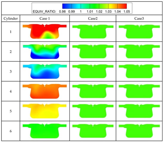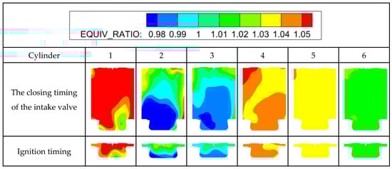 Equivalence ratio distribution of 6 cylinders at ignition timing under three cases.