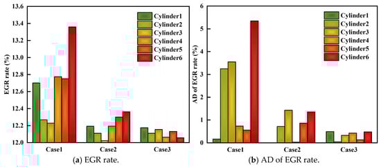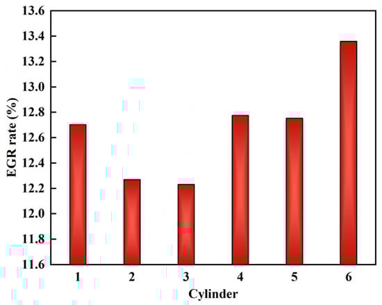 where represents the EGR rate, is the mass of fresh air, and is the mass of exhaust gas. Figure 11 compares the EGR rate among the six cylinders. It is evident that there is a significant unevenness in the EGR rate among the cylinders. Specifically, cylinder 3 exhibits the lowest EGR rate of 12.23%, while cylinder 6 shows the highest, at 13.36%. The difference rate of EGR rate between cylinder 3 and cylinder 6 is up to 9.23% relative to cylinder 3.