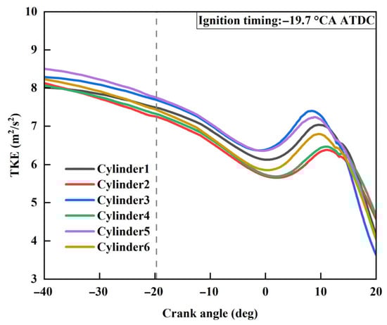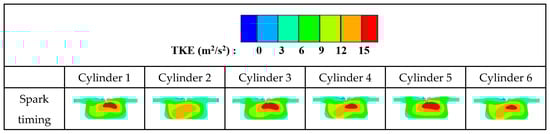 Figure 12 and Figure 13 present a comparison of the turbulent kinetic energy (TKE) curves and TKE distribution among the six cylinders, respectively. It is evident from the figures that significant differences in TKE existed during the whole cycle. Cylinders 1, 3, and 5 had higher TKE than cylinders 2, 4, and 6 near the ignition timing and the top dead center. Moreover, at the ignition timing, cylinder 3 exhibited the highest TKE, with a large high-TKE region around the spark plug, while cylinder 2 had the lowest TKE, with a small high-TKE region. During the combustion process, due to the mutual interaction between flow and combustion, the differences in flow intensity during combustion became larger compared to those during the cold flow. These differences are related not only to the inherent variations in flow states prior to ignition but also to the difference in the combustion process.
