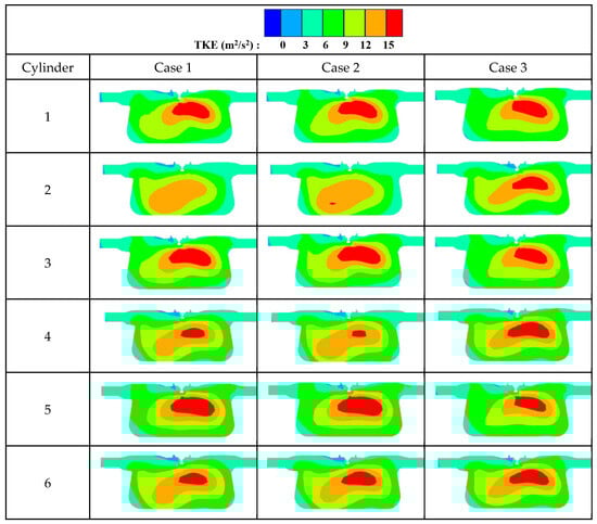 Figure 18 compares the turbulent kinetic energy contours of each cylinder at ignition timing under three cases. It can be observed that the uniformity of the initial turbulent kinetic energy among cylinders in case 3 is significantly better than that in case 1 and case 2. Furthermore, for all three cases, the TKE distribution of cylinders 1, 3, and 5 is similar while that of cylinders 2, 4, and 6 is also similar, and the similarity in TKE distribution is not strongly correlated with the uniformity of mixing or distribution.