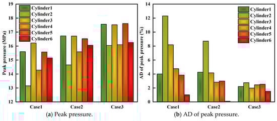 Figure 19 compares the peak pressure and AD of peak pressure among the six cylinders under three cases. It is evident that with the improvement in mixture uniformity and distribution uniformity, the peak cylinder pressure of each cylinder increases. Of course, this may also be related to the reduction in EGR rates observed in case 2 and case 3. Meanwhile, it can be observed that cylinders 1, 3, and 5 exhibit higher peak pressures than those of cylinders 2, 4 and 6 under all three cases. As the mixture uniformity and distribution uniformity improve, the AD of the peak pressure decreases gradually, meaning that the peak cylinder pressure of each cylinder is closer to the average.