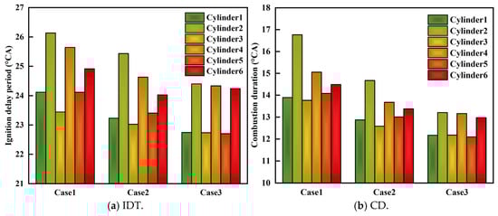 Figure 20 compares the ignition delay time and combustion duration under three cases. It is apparent that compared to case 1, the improvement in mixture uniformity of case 2 results in significant shortening of both the IDT and CD for each cylinder. Based on case 2, further enhancement in the distribution uniformity of case 3 leads to further shortened IDT and CD for each cylinder. However, the relative relationships of the combustion phases among all six cylinders remain unchanged for all three cases.