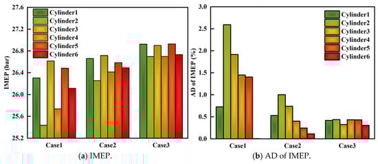 Figure 21 compares the IMEP and AD of IMEP under three cases. It is observable that compared to case 1, the improvement in mixture uniformity in case 2 significantly increases the IMEP of each cylinder. Based on case 2, continued improvement in distribution uniformity results in a continued increase in the IMEP of each cylinder, and the variability among cylinders gradually improves. The AD of IMEP of all six cylinders decreases as uniformity improvement measures are applied.