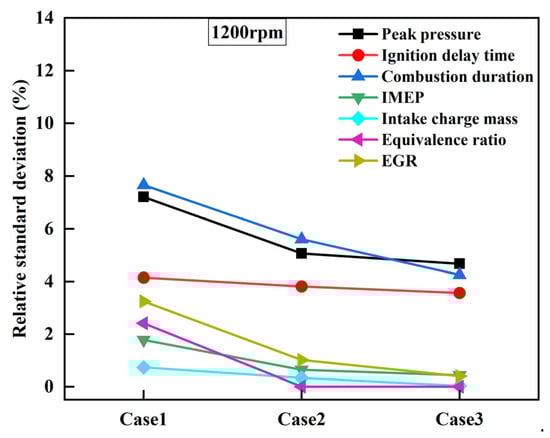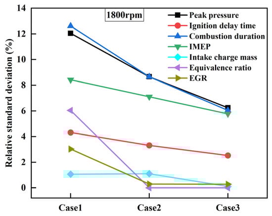The RSD of peak pressure, IDT, CA, IMEP, intake charge, and equivalence ratio for each case was calculated. As shown in Figure 22, when comparing case 1 with case 2, the RSD of various parameters is decreased for case 2, with the condition of uniform mixing of fuel, air, and exhaust gas. For example, the RSD of peak pressure is decreased by 2.15%, and the RSD of combustion duration is decreased by 2.06%. When comparing case 3 with case 2, the RSD of the parameters for case 3, with the condition of uniform mixing and uniform distribution, shows a continued decreasing trend. The RSD of peak cylinder pressure is decreased by 0.39%, and the RSD of combustion duration is decreased by 1.35%. However, relatively speaking, the decrease in RSD from case 2 to case 3 is less pronounced compared to that from case 1 to case 2. This indicates that, compared to the impact of mixing uniformity, the distribution uniformity has a relatively smaller weight in affecting the CTCV. Therefore, subsequent research aimed at improving CTCV could focus on enhancing the mixing uniformity of the combustible mixture.