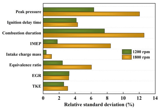 To verify the reliability of the aforementioned analytical conclusions, an analysis of the non-uniformity phenomenon and its primary influencing factors was conducted under full-load conditions at high speed (1800 rpm). Figure 23 compares the RSD of the main analyzed parameters that affect engine non-uniformity at two test speeds. Compared to the condition of 1200 rpm, the RSD of various parameters under the condition of 1800 rpm increased significantly, which indicates an increase in the non-uniformity among cylinders. For the high-speed condition, due to the increased demand for fuel and air, the boundary parameters of the equivalence ratio and intake charge become more obvious, which would amplify the CTCV in engine power and combustion process.