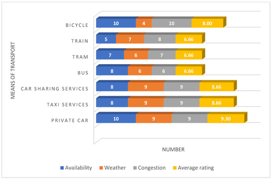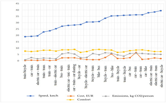 - The analyzed variants of using individual means of transport are not able to guarantee the highest standards in each of the criteria studied. High values in one criterion usually lead to worse parameters in other categories. However, it is possible to identify several types of variants of using two means of transport, which can be assessed satisfactorily in terms of the four analyzed criteria.