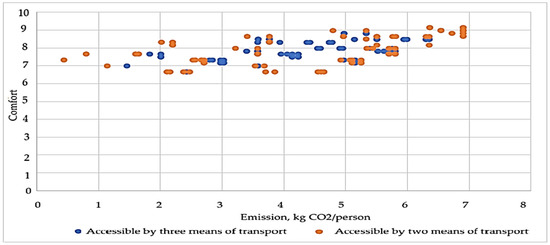 - in Figure 12, the emission is a maximum of 3 kg/CO2 per year, and the commuting comfort is a score not lower than 8.33,
