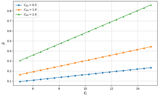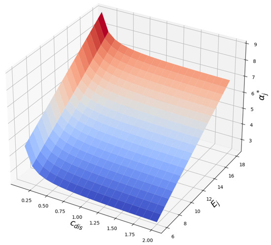 In Figure 3, we analyze the effect of and on the optimal value of EVCF. Since the variables have a proportional relationship with , it can be confirmed that increases with the increment of variables, as depicted in Equation (15). In the equation, we confirm that is a variable that affects the determination of . Since is affected by changes in and , it can be confirmed that the value of becomes close to 0 when one of the variables is set close to 0.