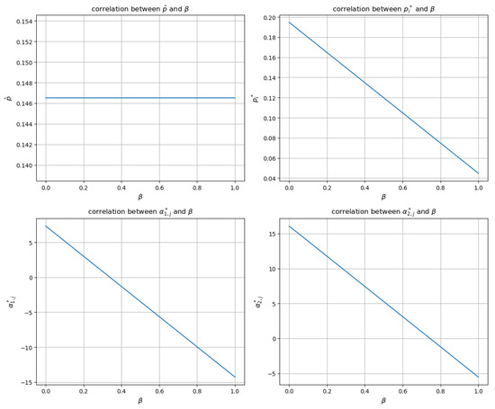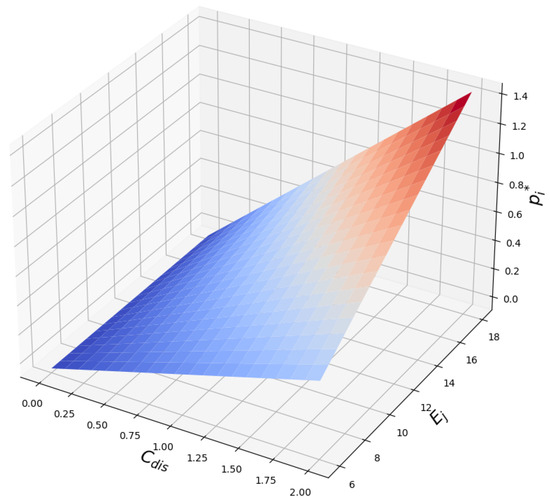 In Figure 2, we illustrate the relationship between the SO’s incentive price and two auxiliary variables and . Equation (19) shows that is directly proportional to and . From the figure, we observe that tends to increase proportionally with the increment of . It is intuitively evident that the influence of is greater than that of . Therefore, we could assume that has a greater impact on the SO’s decision-making than . This hypothesis can be confirmed through the analysis of Equation (19) and the simulation results.