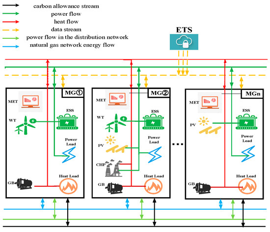 One of the leading causes of global warming is the sharp rise in carbon emissions. To achieve sustainable development, governments have developed strategies to reduce carbon emissions. Carbon emission reduction has become a key area in power system research [1]. Renewable energy sources such as solar and wind are favored for their cleanliness; for example, the Chinese State Council’s “2024–2025 Energy Conservation and Carbon Reduction Action Plan” mandates that non-fossil energy consumption accounts for 20% of total energy consumption by 2025, accompanied by quantitative targets of adding 200 gigawatts of new wind and solar power capacity and achieving renewable energy consumption exceeding 1.1 billion tons of standard coal, but their access may impact the power grid [2,3]. Microgrid technology has emerged as a solution to this problem. The emergence of microgrid technology provides an effective solution to this problem. It integrates multiple distributed power sources, energy storage, and loads to enhance the reliability of the power supply. Microgrids can operate independently from main grid faults, provide a stable power supply, and enhance the stability and robustness of the power system. At the same time, it promotes diversified energy utilization. Microgrids can integrate different energy resources, such as solar energy, wind energy, energy storage, etc., to promote diversified energy utilization. Microgrids can promote the access and utilization of renewable energy, reduce the dependence on traditional fossil energy, promote the development of clean energy, and help to meet the challenges of climate change [4]. Microgrids’ role is becoming increasingly prominent in the energy transition and the construction of new power systems [5]. In June 2025, new regulations issued by the National Energy Administration of China will exempt smart microgrids, distributed photovoltaic power generation, and new energy storage technologies from power business licensing requirements, significantly reducing the institutional costs of the “behind-the-meter” power sales model and mandating that grid companies provide non-discriminatory interconnection services. However, individual microgrids are affected by uncertainties such as new energy output and price fluctuations in the power market, and they suffer from low energy utilization and high operating costs. At the same time, the microgrid scale is relatively small, and once a failure or problem occurs, it may affect the operation of the entire microgrid system, and there is system vulnerability. For this reason, forming a multi-microgrid system (MMG) has become an effective strategy to enhance the new energy acceptance capacity, improve the reliability and stability of the power supply, and reduce operating costs [6]. In summary, MMGs are essential in enhancing the utilization of new energy and carbon emission reductions through energy sharing and optimal scheduling [7,8,9].