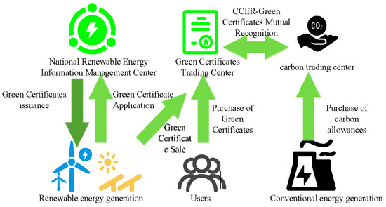 GCT targets new energy consumption, while CET considers the system’s carbon emissions. Using green power generated from renewable energy sources instead of traditional energy sources can satisfy the dual needs of carbon emission reduction and new energy consumption, for which the two trading mechanisms can be linked to achieve a more economical low-carbon optimization. Figure 2 shows the CET-GCT joint trading mechanism principle, in which Chinese certified emission reduction (CCER) plays a vital role in promoting the convergence and synergy of China’s electricity market. Since CCERs and green certificates (GCTs) form a mutual recognition relationship through electricity substitution and CCERs and carbon allowances can be converted into equivalents, CCERs can be used as a bridge to realize mutual recognition between green certificates and carbon allowances. This mechanism makes the carbon emission trading system (CET) and the green certificate trading system (GCT) coupled with each other and jointly promotes the realization of carbon emission reduction targets.