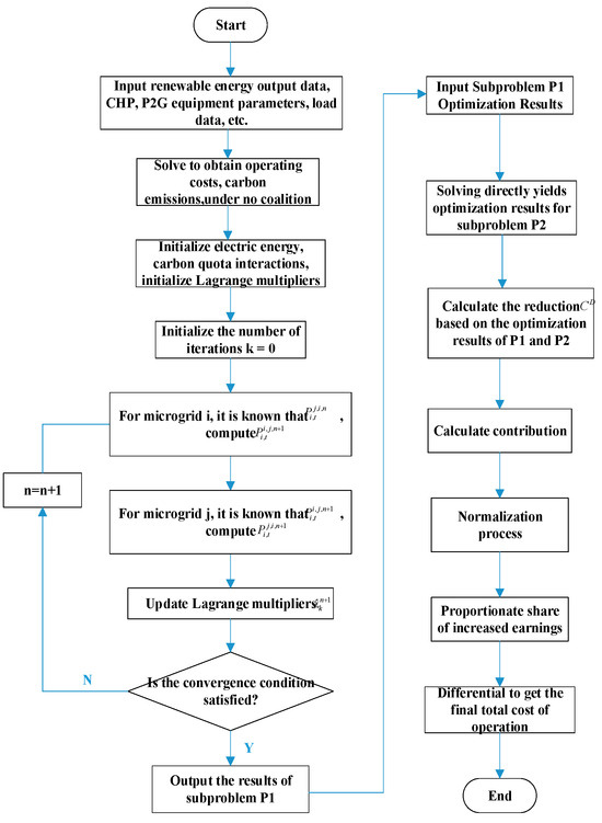 (3) An optimization solution algorithm process for multi-microgrid cooperative operation, considering green certificates and carbon trading, was established. Addressing the limited consideration of carbon quota trading between microgrids in existing research and the fact that most studies on multi-microgrid collaborative optimization focus solely on system-wide optimization while neglecting the issue of profit distribution between microgrids after the interaction, this paper incorporates electricity and carbon quota trading between multi-microgrid systems in the solution process. In solving the optimization objective function for multi-microgrid collaborative operation, it is decomposed into two subproblems: subproblem P, which minimizes the cost of electricity–carbon interaction in the multi-microgrid system, and subproblem Q, which involves the reasonable allocation of profits. The ADMM algorithm is employed to solve the subproblem of minimizing costs after the electricity–carbon interaction, while an asymmetric energy mapping contribution function is used for profit distribution.