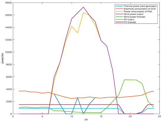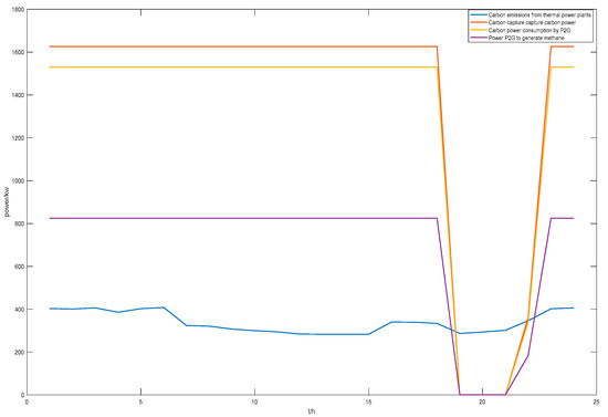 In the formula, is the amount of CO2 captured by the CCS system of microgrid i at time t; is the conversion coefficient between the amount of electric power consumed by the CCS and the amount of CO2 captured by the CCS, which is taken as 0.55 in this paper [34]; and are the amounts of CO2 delivered by the CCS system of microgrid i to the P2G equipment and the carbon storage equipment, respectively, at time t; is the amount of electric power consumed by the CCS system of microgrid i at time t to capture CO2; and and are the amounts of electric power provided to the CCS system by wind power and photovoltaic (PV) at microgrid i at time t.