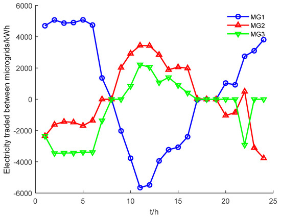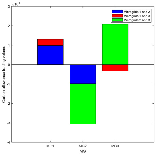 Table 2 demonstrates the changes in the operating costs of each microgrid after the end of the electric–carbon sharing operation. Specifically, the operating cost of Microgrid ① is significantly reduced from 47,786.1 yuan to 32,684 yuan, the operating cost of Microgrid ② is further reduced from −7189.66 yuan to −26,777 yuan, and the operating cost of Microgrid ③ is also slightly increased from 115,420 yuan to 121,652.3 yuan. Although the total cost of multi-microgrids realized a reduction in profit, there is still an imbalance in the distribution of benefits. To solve this problem, this paper redistributes the alliance benefits of the three multi-microgrid subjects. Specifically, the electric–carbon interaction information of the electric–carbon sharing result is first substituted into the asymmetric energy mapping contribution function to obtain the contribution ratio of Microgrids ①, ②, and ③. Subsequently, the benefits are distributed to each microgrid subject according to the contribution ratio of each subject, realizing the redistribution of benefits. After redistribution, the operating cost of micro-network ① is further reduced from 47,786.1 yuan to 33,951.1 yuan, the operating cost of micro-network ② is also reduced from −7189.66 yuan to −22,333.66 yuan, and the operating cost of micro-network ③ is significantly reduced to 106,102.9 yuan. This result shows that each micro-network receives the corresponding benefit according to its contribution, confirming the necessity and superiority of time-sharing asymmetric benefit redistribution.