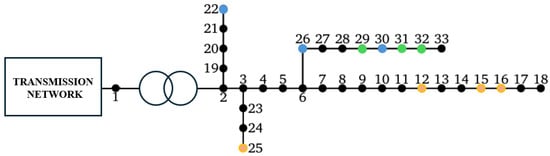For the sake of validation, the optimization problems presented in Section 3.1 and Section 3.2 are tested on a 33-bus distribution network with multiple ramifications, depicted in Figure 2, where the presence of three RECs is outlined by using different colours for each REC member; one can refer to Table 1 for all the grid paraments and data.