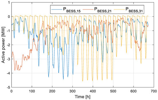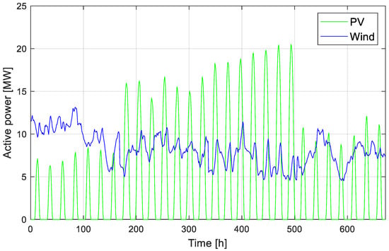 For the sake of readability, individual power profiles are omitted; instead, Figure 3 and Figure 4 report the aggregated profiles per technology (i.e., load, PV and wind) where one can see the relevant amount of RESs included in the test case grid. Detailed time profiles for each technology at each bus are available in the Supplementary Material for the interested reader [].