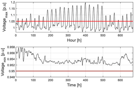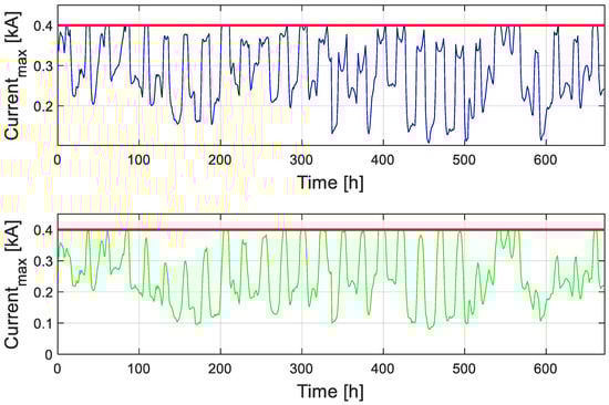 Considering the voltage limits vmax and vmin equal to 1.05 p.u. and 0.95 p.u. and the current limit Ilim equal to 400 A, the Flat scenario is characterized by a total of 3938 overvoltage violations, 556 current limit violations, and 109 violations concerning the transformer overload in the primary substation. In general, within a 274 h period, at least one violation is recorded, representing 40% of the time considered. In the Flat scenario, electrical quantities appearing in the constraints of the proposed optimization problems are calculated simply to highlight network violations if no action is taken. Figure 5 shows the maximum (minimum) voltage value in the grid for each hour, highlighting vmax and vmin thresholds in red. One can notice overvoltage problems during 216 central hours of the days across the four analyzed weeks. Similarly, Figure 6 reports the maximum current value for each hour, highlighting that, during these hours, at least one line experiences overcurrent issues, meaning that the current exceeds the limit of 400 A (as indicated by the horizontal red line).