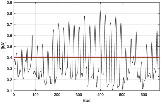 The line current profile shows that, in 209 h, at least one line experiences overcurrent issues, meaning that the current exceeds the limit of 400 A (horizontal red line). It should be noted that the profiles of the maximum (minimum) quantities displayed do not pertain to a specific network element, node, or line, but correspond to the network element that is characterized by the maximum (minimum) value in the analyzed hour.