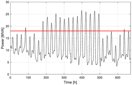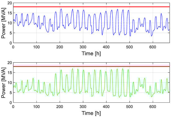 Figure 7 illustrates the apparent power flowing into the transformer, with the transformer rating represented by a red horizontal line. It is possible to notice how the transformer rating limit is exceeded for 109 h, indicating that, without intervention, either curtailment or a transformer revamp shall be considered.