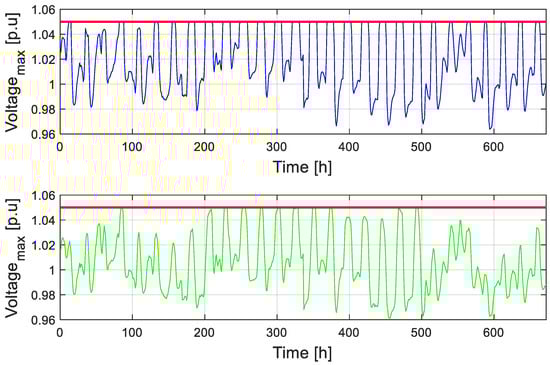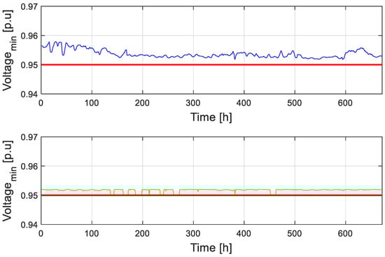 Starting from this complex and critical configuration, the comparison with the grid operation if RES curtailment if considered is proposed below, alongside an introduction of the proposed VI operation of RECs. Figure 8 and Figure 9 show the voltage of the bus with the maximum (minimum) voltage value for each hour, providing a comparison between the RES Curtailment scenario and the Curtailment with VI scenario. As one can see, RES curtailment provides a solution to the problem of voltages reaching values very close to the considered operational limits. On the other hand, VI operation has a more effective impact on the system voltages.