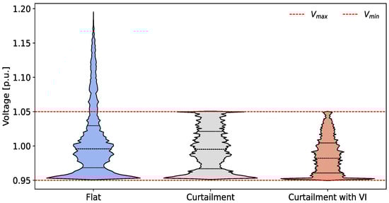 Violin plot of voltage distribution in the considered scenarios.