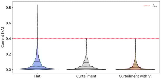Violin plot of line current distribution in the considered scenarios.