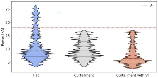 Violin plot of transformer power flow distribution in the considered scenarios.
