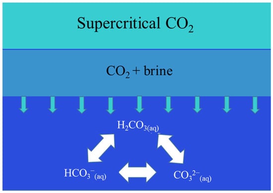 CO2 reactive transport modeling integrates multiphase fluid flow, solute transport, and geochemical reactions to evaluate the behavior of CO2 injected into geological formations such as saline aquifers. When CO2 is injected into saline aquifers, it dissolves in the water and forms carbonic acid (H2CO3), which breaks down into bicarbonate (HCO3−) and carbonate (CO32−) as seen in Figure 1. This reaction significantly lowers the pH, acidifying the environment and leading to the dissolution of silicate and oxide minerals. As these minerals dissolve, concentrations of ions like calcium (Ca2+), magnesium (Mg2+), sodium (Na+), silica (SiO44−), and iron (Fe2+) increase in the solution [18,19,20]. This increase facilitates the secondary precipitation of silica, silicates, and carbonates [21,22,23]. As CO2 continues to migrate within the reservoir, these geochemical changes impact the reservoir rock’s porosity and permeability.