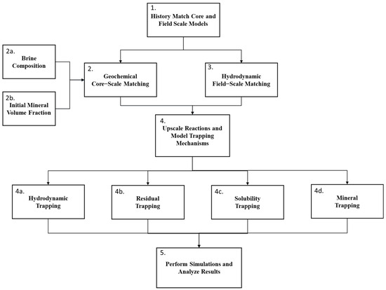 In this section, we explore the reactive transport modeling approach employed to simulate and analyze the long-term behavior of CO2 storage within the Entrada Sandstone formation. The initialized base case model is history-matched using observed data from nearby saltwater disposal wells to validate the simulation model to be utilized in simulating geochemical reactions, informed by brine composition and X-ray diffraction (XRD) data. Figure 2 delineates the detailed steps followed in the reactive transport modeling process used in this study for the field-scale simulations.