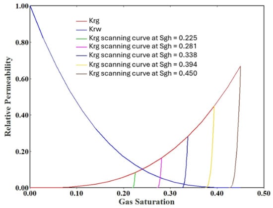 The Brooks–Corey function was used to create the relative permeability curves for gas and water [51], which was applied to experimental data obtained from sandstone samples from the Entrada formation. Figure 3 illustrates the relative permeability curves for the gas phase, featuring five scanning curves used for modeling hysteresis (residual trapping).