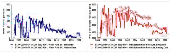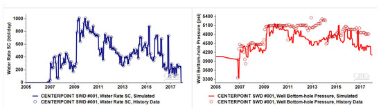 History match results for Centerpoint SWD (water rate and well bottom-hole pressure).