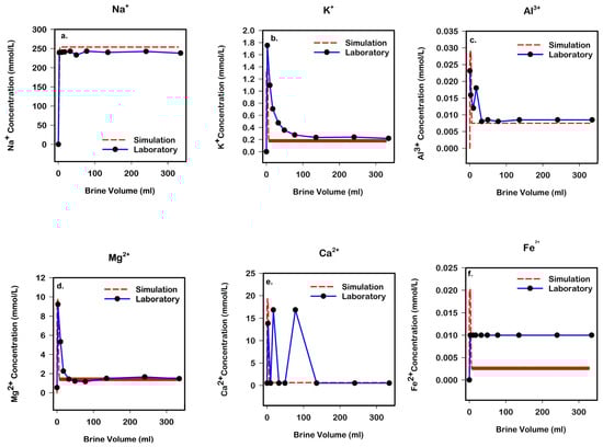 The graphs in Figure 7 illustrate a comparative analysis of ion concentrations measured in flow-through experiments on a core sample against those obtained from corresponding simulations across various brine volumes. The ions analyzed include Na+, Fe2+, K+, Mg2+, Ca2+, and Al3+, with each subplot (a–f) detailing how the concentrations of these ions change over the course of the experiment.