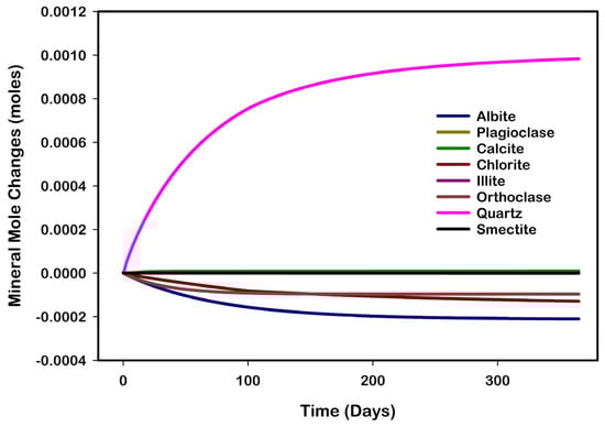 The results of the forecasting, as shown in Figure 8, illustrate the changes in mineral moles over a 365-day period. Quartz and calcite are observed to precipitate out of the solution, while the remaining minerals undergo dissolution.