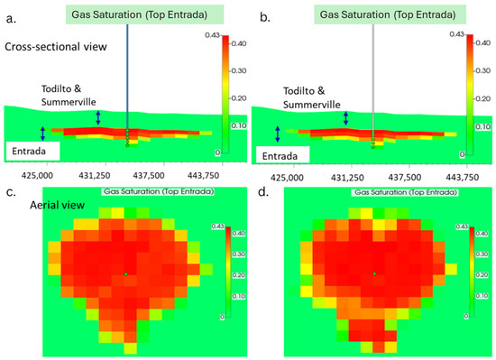 CO2 plume evolution in the reservoir: (a) cross-sectional view after injection; (b) cross-sectional view after 100 years; (c) aerial view after injection; (d) aerial view after 100 years.