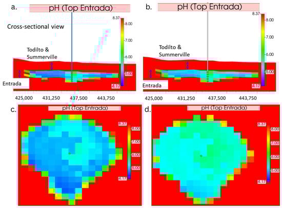 Evolution of pH: (a) cross-sectional view after injection; (b) cross-sectional view after 100 years; (c) aerial view after injection; (d) aerial view after 100 years.