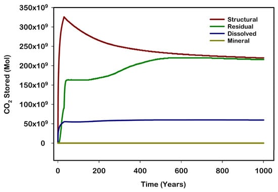 At the conclusion of the 500-year simulation, structural, residual, dissolved CO2, and mineral-trapped CO2 account for 45.43%, 42.95%, 11.59%, and 0.03%, respectively. This trend persists until the 1000-year mark. The model’s mineralization calculations were confined to carbonate minerals, primarily calcite, and excluded changes in non-carbonate minerals, which do not contribute to mineral trapping of CO2 [48].