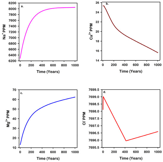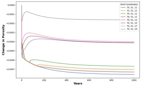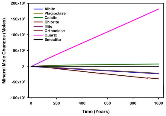 Beyond calcite, Figure 16a–d show the behavior of other minerals over 1000 years, shedding light on the reservoir’s evolving geochemistry. Quartz exhibits consistent precipitation throughout the period, which tends to reduce formation porosity as the mineral occupies previously open pore spaces. In contrast, chlorite and illite show steady dissolution over the same timeframe, potentially increasing formation porosity and partially offsetting the effects of quartz and calcite precipitation. This balance between mineral precipitation and dissolution illustrates the complex geochemical adjustments within the reservoir.