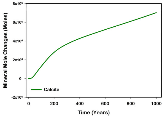 Figure 15 shows long-term changes in calcite precipitation over 1000 years. The graph indicates a continuous increase in calcite moles, reflecting a steady progression toward chemical stabilization in the system. Initially, high precipitation rates suggest an abundance of Ca2+ ions within the first 200 years; afterward, the rate of precipitation slows as Ca2+ availability declines due to plume stagnation. This pattern suggests that the brine composition and CO2 injection conditions promote calcite formation.