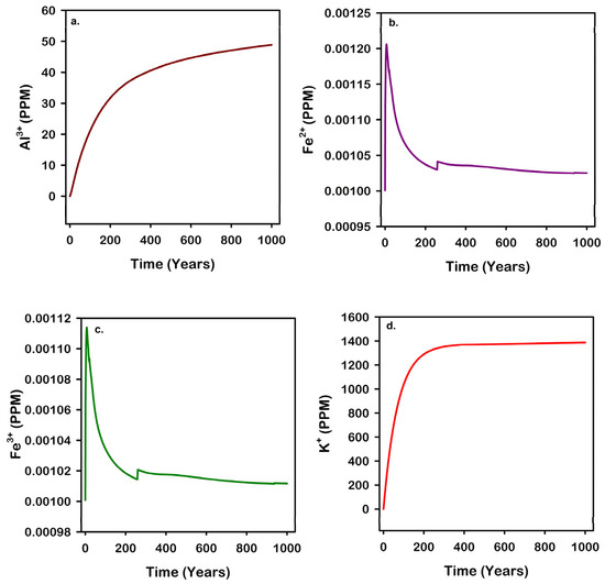 Figure 11 illustrates the changes in pH levels and hydrogen ion (H+) concentrations in response to CO2 injection, as shown in Figure 11a,b, which depict the temporal evolution of these parameters at the injection well and at varying distances from it. In Figure 11a, a sharp decrease in pH is observed at all monitored locations (the wellbore, 1000 feet, and 2000 feet laterally) during CO2 injection, with the most significant decline near the wellbore, where CO2 concentration is initially highest. This acidification results from CO2 dissolution in formation water, which increases H+ concentration (Figure 11b). During injection, H+ concentration rises sharply, followed by a marked decrease, mainly due to CO2 migration and geochemical reactions within the aquifer. The dissolution of minerals, such as calcite, consumes H+ ions and releases divalent cations like calcium. These cations can precipitate as carbonate minerals, sequestering CO2 from the aqueous phase and reducing acidity. Additionally, non-carbonate minerals in the formation, such as chlorite and smectite, contribute to the neutralization process through their own dissolution, which consumes H+ ions. This buffering mechanism stabilizes pH over time after the initial CO2 injection.