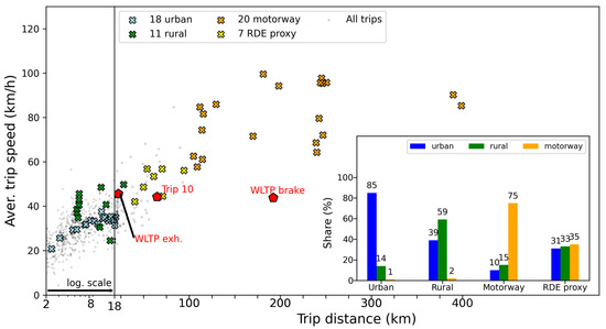 Average trip speed vs. trip distance from the real-world test campaign. Crosses indicate the selected urban, rural, motorway, and RDE-proxy trips. The distance-weighted percentages of urban, rural, and motorway are presented in the nested bar plot on the bottom right. The laboratory WLTP exh., WLTP brake and Trip 10 cycles are plotted with red diamonds to put the results into context.