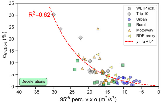 Figure 11 plots the values as a function of the 95th percentiles of the . The exponential fitting of the results (R2 = 0.62) and indicates an acceptable correlation of the two parameters, although the variability is not entirely captured. In other words, a higher contribution of friction brakes is expected with more aggressive braking. Similar trends can be seen plotting in function of the quality criteria in GTR 24: the Inertial Power Difference Rating (IPDR (%) and Work IPDW (J/kg). However, they are not plotted as these parameters are available only for laboratory tests.
