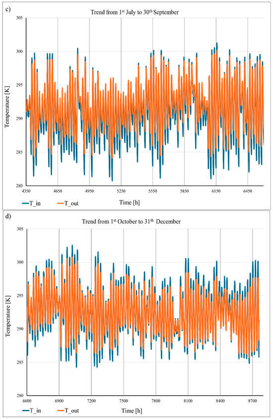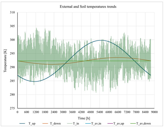 As can be seen from Figure 4, the temperatures of the soil undergo slight variations throughout the year at a depth of 1 m, peaking near 300 K. As the depth increases, the oscillations are stabilised, leveraging the characteristics of the soil and contributing to a nearly constant temperature trend throughout the entire year.