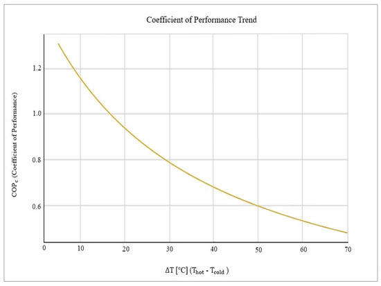 Figure 5 reports the trend of the COPc of a Peltier cell as a function of ΔT. The theoretical cooling Coefficient of Performance (COPc) of the Peltier cell is defined as follows: