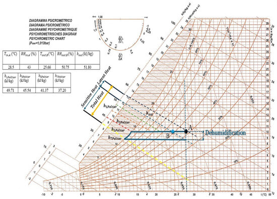 Later, in the Peltier section, the air flow is split into two flows, one laps the cold side and the other laps the hot side. Using the thermal power exchanged with both sides of the Peltier cells, the enthalpy variations of both flows are calculated by the use of the ASHRAE psychrometric diagram.