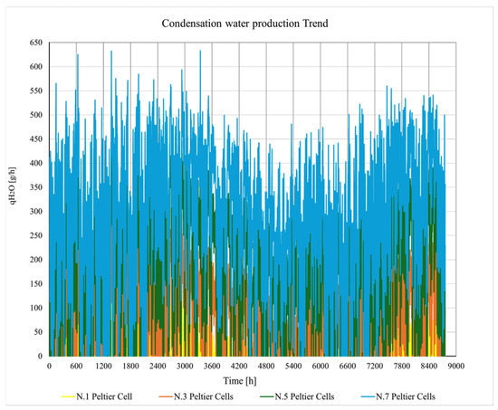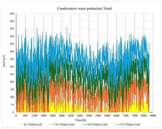 In general, dynamic simulations were performed throughout the year in order to obtain the values of condensed water flow rate. In fact, the trend is shown in Figure 8. The analysis indicates a fluctuating condensation trend with one, three, and five Peltier cells, alternating between no condensation and gradual increases, reaching up to 168.25 g/h with one cell. With seven Peltier cells, condensation increases significantly, peaking at 632.05 g/h in May at 3343 h.
