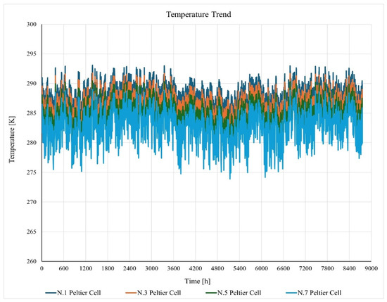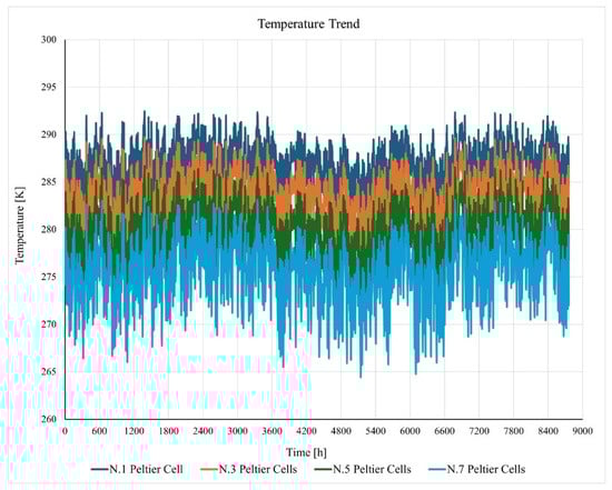 Similarly, the temperature variations at the outlet of the Peltier cell section were systematically analysed, the results of which are illustrated in Figure 9. With one Peltier cell, the outlet air temperatures vary from approximately 293.08 K to 280.47 K (considering the extreme values), reflecting a modest cooling effect. As the number of active Peltier cells increases, the system demonstrates a progressively greater cooling capacity, with outlet temperatures decreasing accordingly.