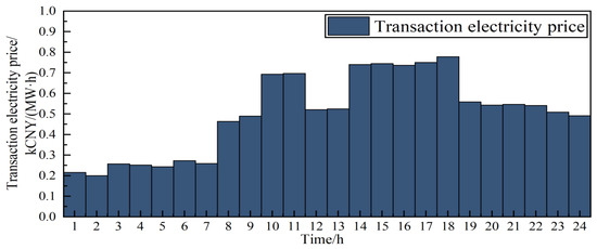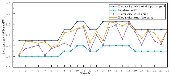 To evaluate the proposed Stackelberg-based dynamic pricing and data center incentive scheme, five initial samples were generated, and a 24 h simulation framework was constructed to capture the key characteristics of a medium-sized distribution network with three virtual power plants (VPPs). The DSO’s purchase and sale prices with the upstream grid follow Guangdong Province’s three-tier “flat/peak/off-peak” tariff structure; Figure 2 illustrates the corresponding market feed-in and grid prices.