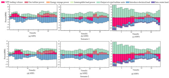 As shown in Figure 5, Scenario 2 introduces a time-varying incentive tariff for VPP 3’s data center, which rises in parallel with wind availability to encourage task scheduling during renewable-rich intervals. By shifting computational workloads into high-wind periods, the data center substantially increases its utilization of low-cost, zero-carbon generation, thereby reducing reliance on conventional gas-turbine dispatch and optimizing storage cycling. This dynamic incentive not only enhances overall wind absorption—allowing VPP 3 to capture otherwise curtailed energy—but also enables its MT and ESS to operate more efficiently outside peak-price windows. In turn, all three VPPs lower their operating expenditures by responding to the time-varying price signals, while the DSO benefits from smoother net demand profiles and increased revenue.