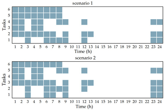 Figure 3 and Figure 4 together reveal how dynamic pricing reshapes both external trading and internal dispatch across the three VPPs. In Figure 3, the optimized scenario shows VPP1 exporting power primarily during the mid-day wind peak, VPP2 maintaining near-zero net trade, and VPP3 persistently injecting surplus wind into the DSO. Under static pricing, however, VPP3’s exports concentrate in early-morning and late-evening hours—when wind output is highest—while mid-day opportunities are overlooked, and VPP1’s exports remain limited. Figure 4 drills down into each VPP’s resource mix. In the optimized case, microturbines and storage discharge are deferred to high-price or low-wind periods, whereas introduced electrical load and interruptible-load curtailment absorb renewable surpluses in mid-day hours. Notably, VPP3 under dynamic pricing schedules most of its data center load and interruptible-load activation into the 9–12 h and 15–18 h windows—precisely when wind farm output peaks—thereby minimizing reliance on thermal generation and storage cycling. In contrast, the baseline dispatches these flexible loads far more uniformly, forcing VPP3 to burn fuel or discharge storage even when abundant wind is available. Figure 5 illustrates the temporal distribution of data center tasks under each scenario. In the baseline case, tasks are spread across the low-tariff overnight window and again late at night, leaving daytime hours under-utilized. With dynamic pricing, the majority of tasks still run in that same low-tariff window, but a few tasks are pulled forward into the adjacent mid-tariff period. This targeted migration indicates that even modest price differentials can induce the data center to reallocate workload into higher-value periods, thereby better aligning computational demand with renewable generation availability.